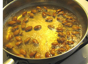 Once the almonds have cooled a bit, simply rub off their papery skins and discard the skins.
